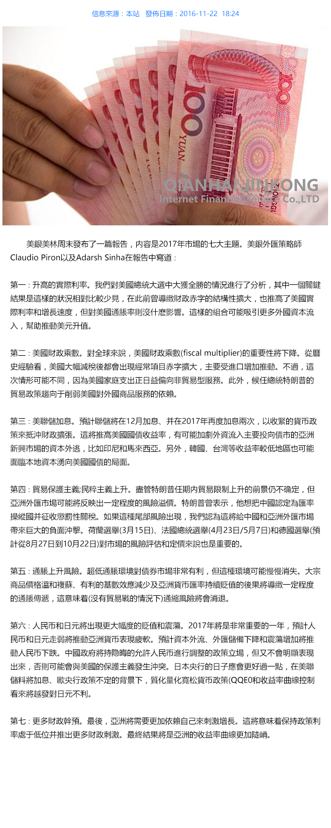 美(měi)銀發布2017市(shì)場7大(dà)主題:人(rén)民(mín)币將更大(dà)幅貶值